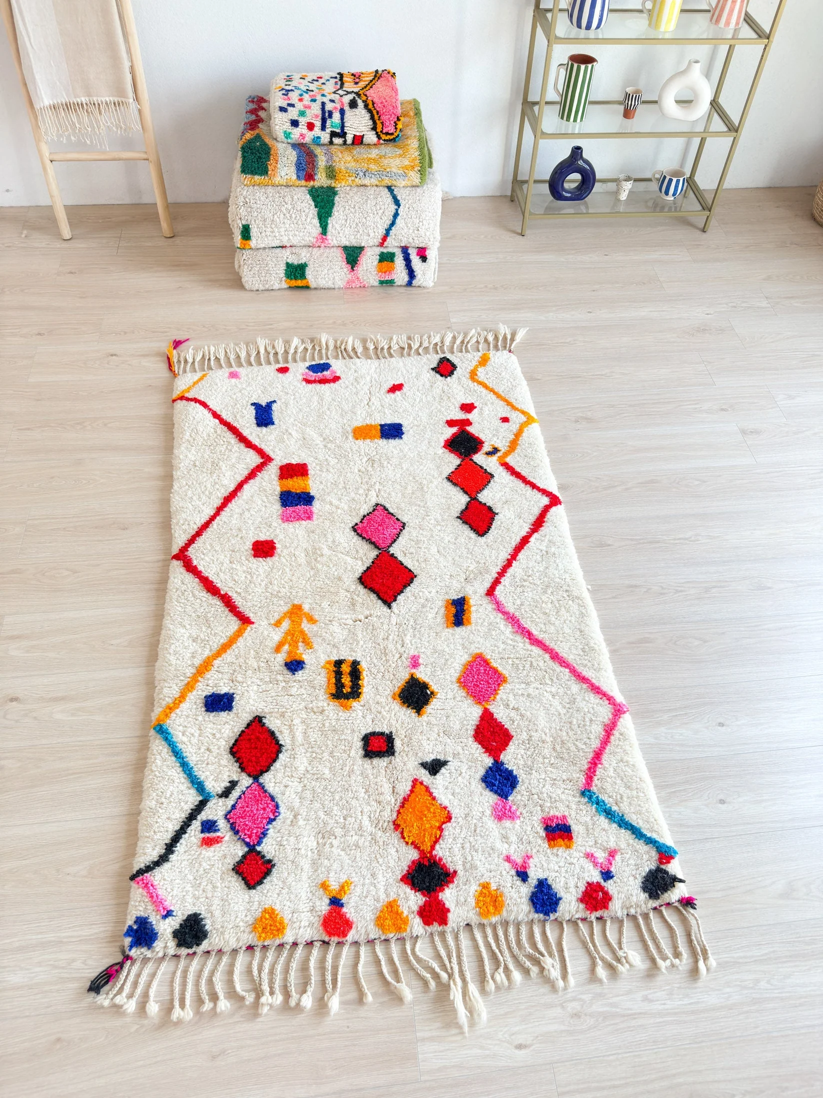 This colorful Berber rug , handmade in the Atlas Mountains, combines tradition and creativity with its unique colorful patterns. Made from natural wool and cotton, it brings a vibrant and warm touch to your home. Ideal for lovers of bold decoration, this rug reflects Moroccan craftsmanship in all its splendor.